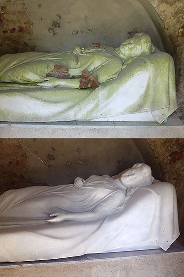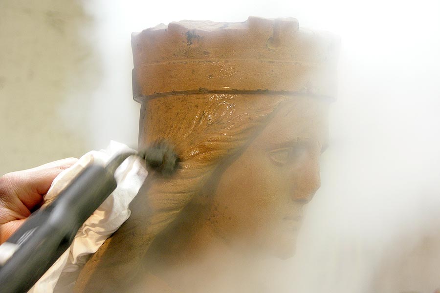 Natursteinreinigungen ohne chemische Zusätze werden bei uns unter anderem im Nass-, Feucht- und Trockenstrahlverfahren je nach Vorgabe des Kunden und des gewünschten Reinigungserfolges durchgeführt. Für feine und filigrane Arbeiten, z.B. im figürlichen Bereich, kommt ein Mikrostrahl- oder Heißdampfgerät zum Einsatz.