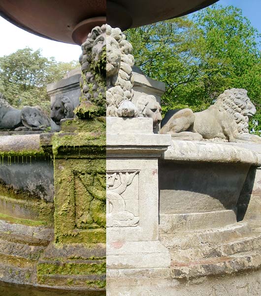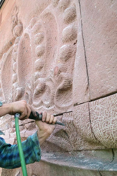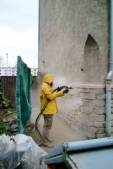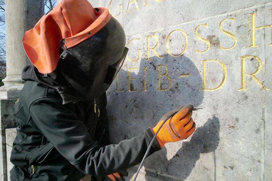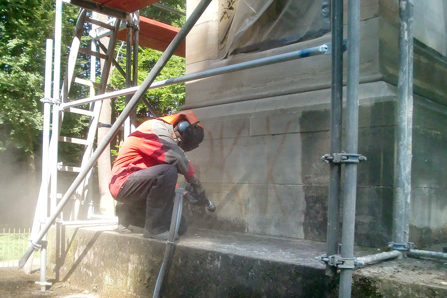 Natursteinreinigungen ohne chemische Zusätze werden bei uns unter anderem im Nass-, Feucht- und Trockenstrahlverfahren je nach Vorgabe des Kunden und des gewünschten Reinigungserfolges durchgeführt. Für feine und filigrane Arbeiten, z.B. im figürlichen Bereich, kommt ein Mikrostrahl- oder Heißdampfgerät zum Einsatz.